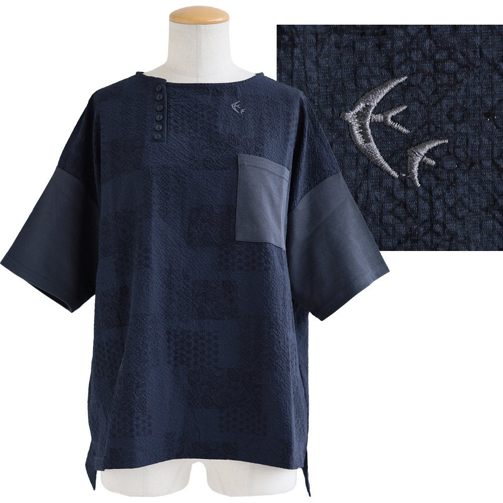 着痩せの「ゆとり」と「アイロン要らず」の日本製ドットシャツ。 シャツ レディース メンズ 半袖 丸襟 ピンドット ドット 日本製 コットン 綿100% おしゃれ 配色 刺繍 刻印ボタン 夏 プルオーバー 風 アイロン不要 すっきり ボックスシルエット 着痩せ 半袖シャツ 仕事 オフィス カジュアル パティ SAIL セイル