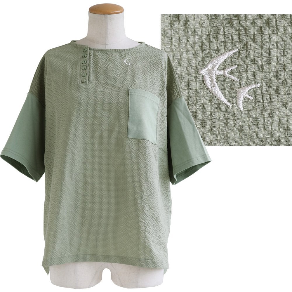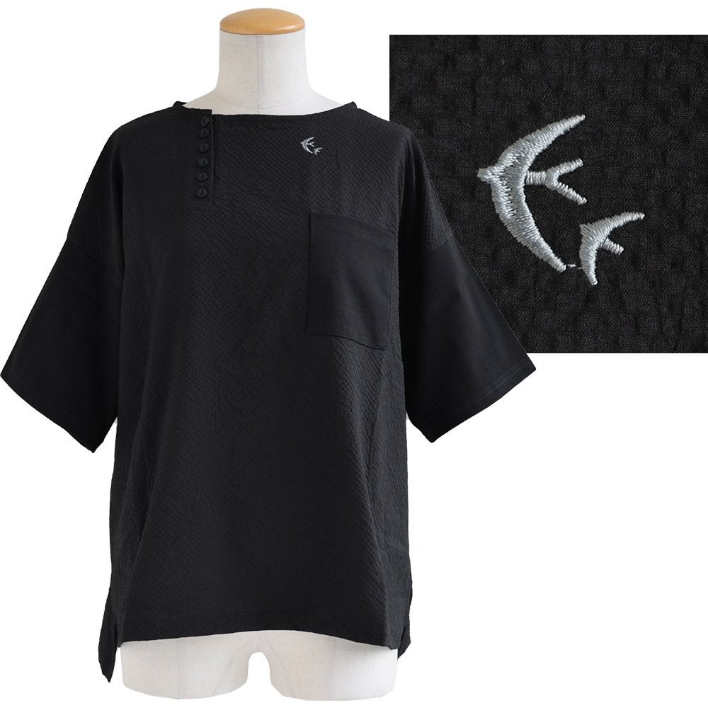 「気張ってないのに、お洒落ってズルい。」と思われる。 【メール便50】 着痩せ tシャツ レディース 五分袖 すっきり ワイド 夏 涼しい 冷感 シアサッカー アシメ ヘンリーネック ボートネック スリット ツバメ 刺繍 ドロップショルダー お尻 二の腕 カバー パティ SAIL セイル