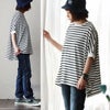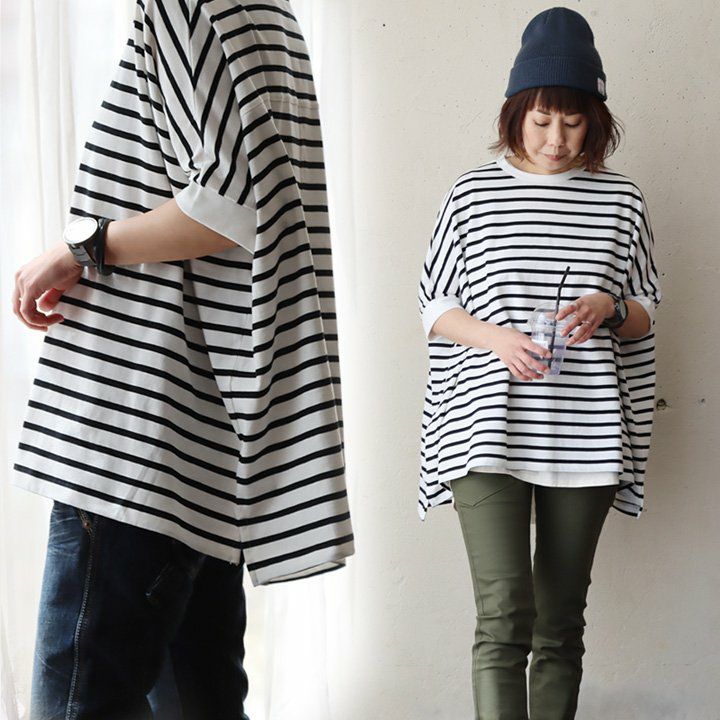 この「生地と変なカタチ」が私に自信をくれました。 カットソー 5分袖 ドルマンプルオーバー レディース 着痩せ クルーネック 配色切り替え ボーダー リブ 綿100% コットン タフ 丈夫 伸縮性 ゆったり ビッグシルエット ワイド 大きいサイズ カジュアル パティ