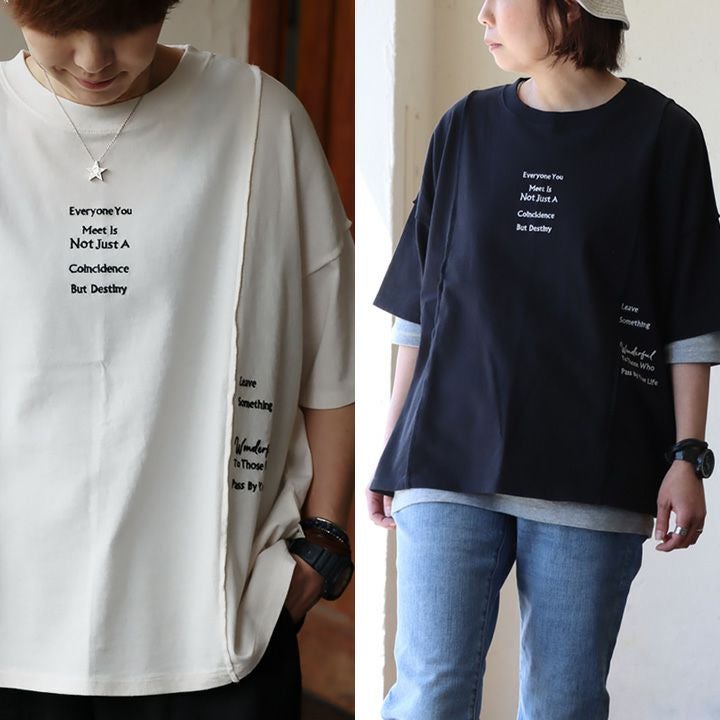 強めなばかりが、リメイクじゃない。 【メール便50】 Tシャツ 半袖 レディース ワイド クルーネック メッセージ 刺繍 切り替え 綿100% コットン 重ね着 ワイド 着痩せ 楽ちん お洒落 春 夏 パティ KAKELA&TRANQUIL カケラ&トランクイル