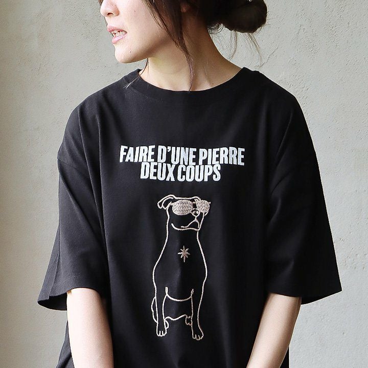 シンプルで意味深な魅力がニクイ。 Tシャツ 5分袖 レディース クルーネック プリント 犬 刺繍 綿100 コットン天竺 伸縮性 通気性 大きいサイズ ゆったり 二の腕 体型カバー カジュアル 夏 夏服 パティ KAKELA&TRANQUIL カケラ&トランクイル