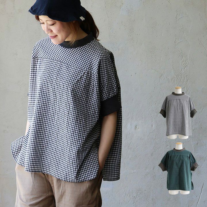 6. 【メール便50】 Tシャツ 半袖 レディース クルーネック ドルマン ギンガムチェック 総柄 綿100 コットン リブ切り替え 通気性 薄手 涼しい ゆったり 大きいサイズ 体型カバー カジュアル 夏 パティ