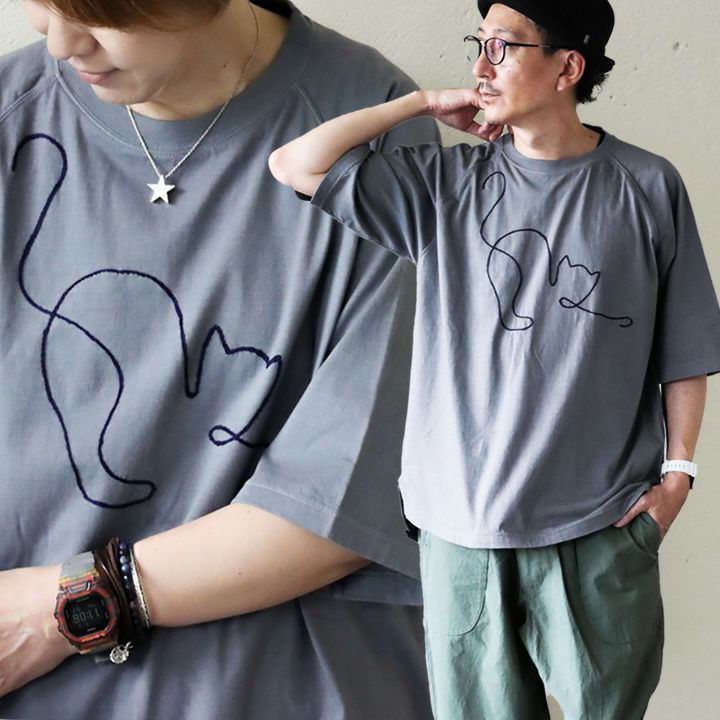肩の力は抜いて、ゆるっと、ラフに。 Tシャツ 5分袖 メンズ レディース クルーネック 猫 ネコ 刺繍 刺しゅう 綿100% 薄手 伸縮性 涼しい 夏 夏服 ゆったり 体型カバー大きいサイズ カジュアル PATY パティ SLOW HANDS スローハンズ