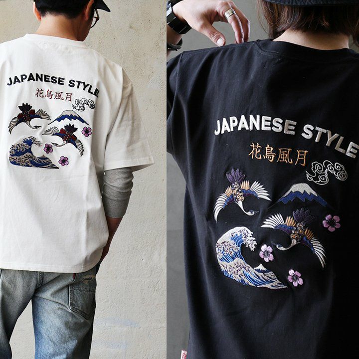 後ろ姿を魅せたくなる「花鳥風月」。 Tシャツ 半袖 メンズ レディース クルーネック 刺繍 花鳥風月 綿100 コットン 伸縮性 通気性 ゆったり 大きいサイズ 体型カバー カジュアル 夏 パティ