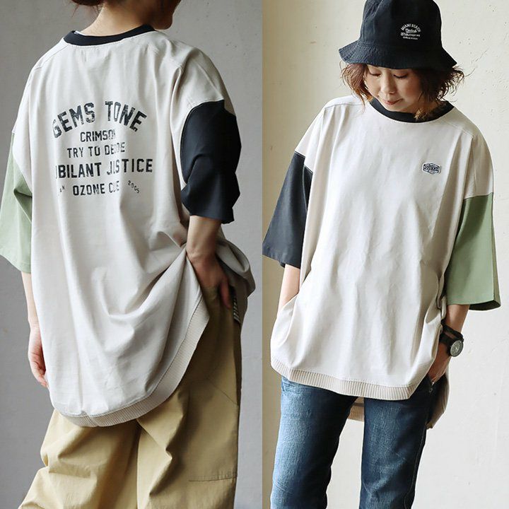大人が「大人かわいい」と認める、良クレイジー! Tシャツ 5分袖 レディース クルーネック お尻隠れる すっきり クレイジー バックプリント 異素材切り替え 綿100% コットン 天竺 ゆったり 体型カバー 大きいサイズ カジュアル 夏 夏服 パティ