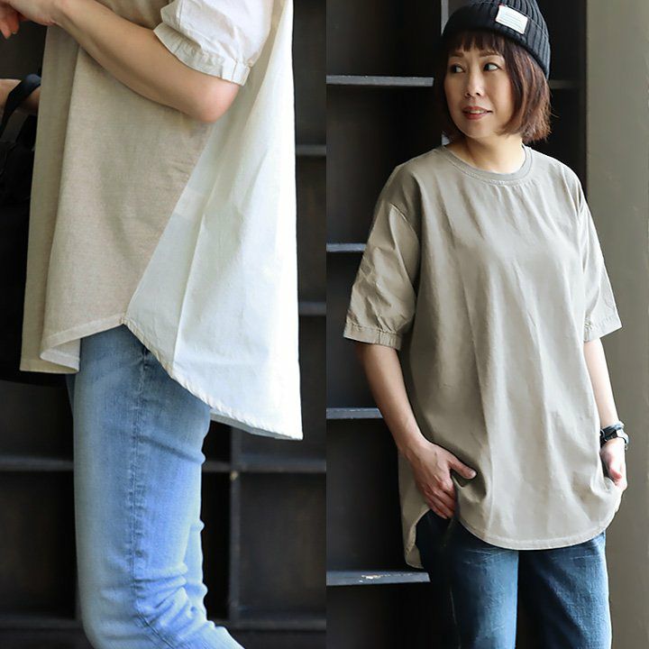 6. 【メール便50】 着痩せ tシャツ ワイド 五分袖 夏 レディース 異素材切り替え 綿100 コットン 二の腕 お尻 体型カバー プリント カジュアル パティ