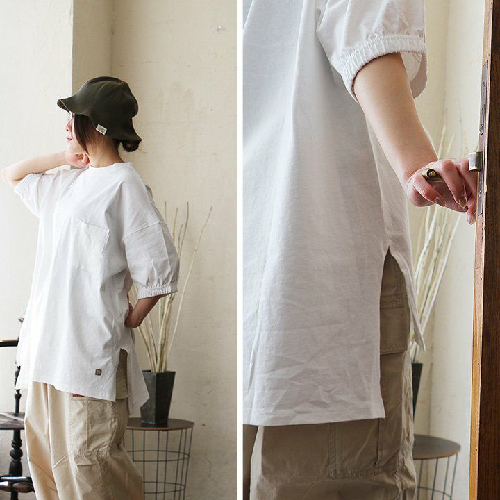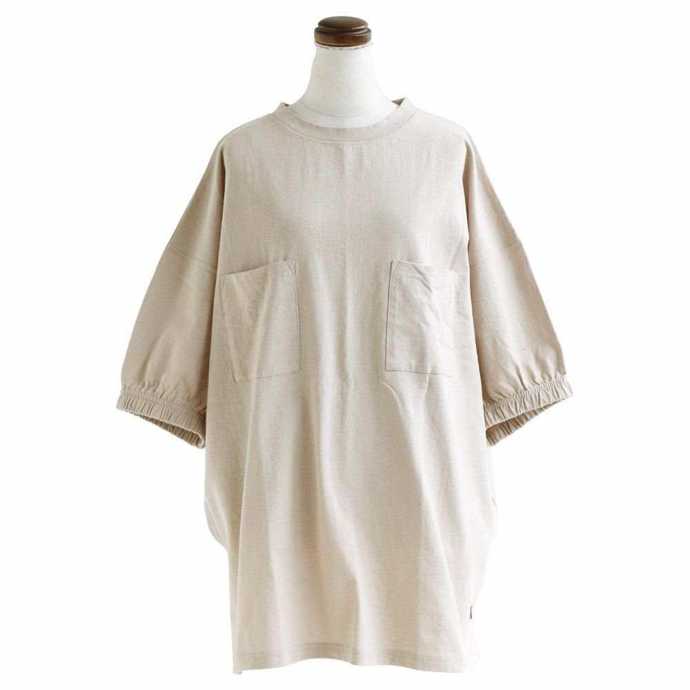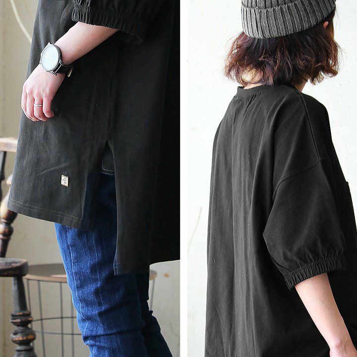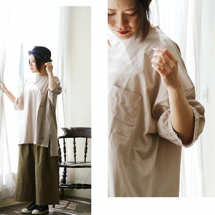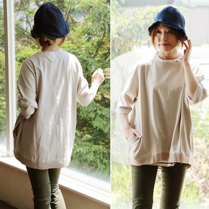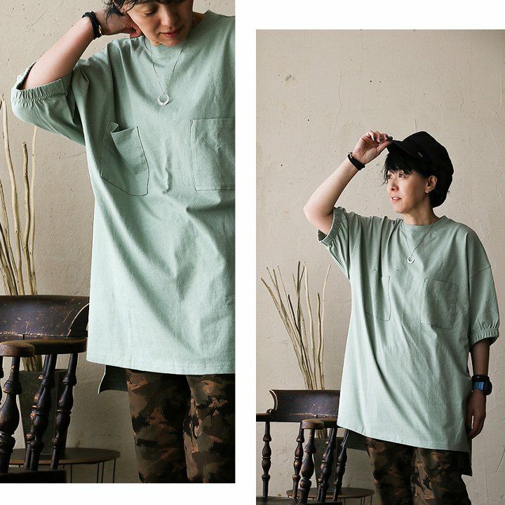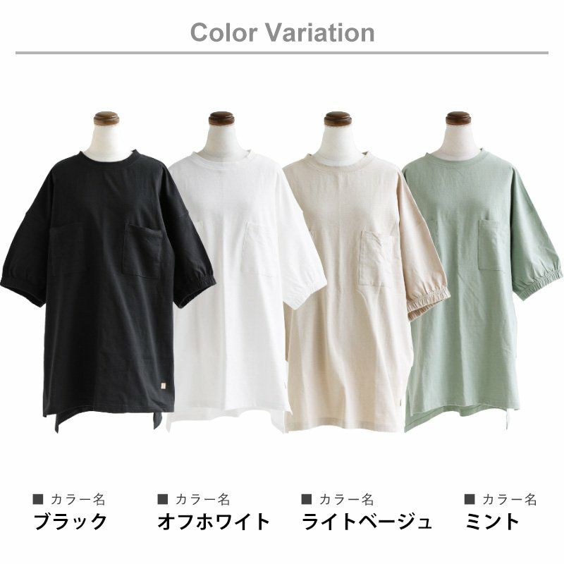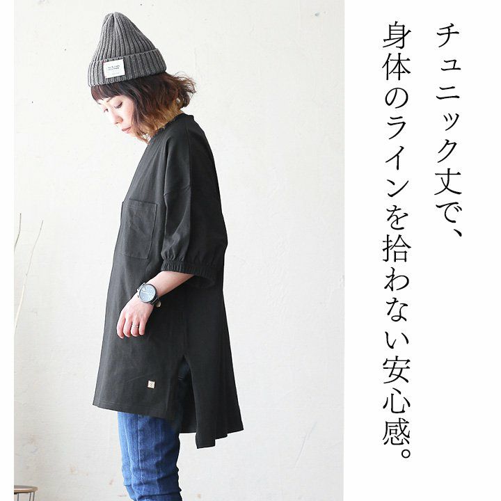 背中のステッチで縦にスッキリ! 【訳あり】 着痩せ チュニック レディース ワイド ひじが隠れる 五分袖 5分袖 夏 裾リブ 綿100 コットン 速乾 体型 お尻 二の腕 カバー 切り替え バックステッチ ポケット 重ね着 カジュアル パティ