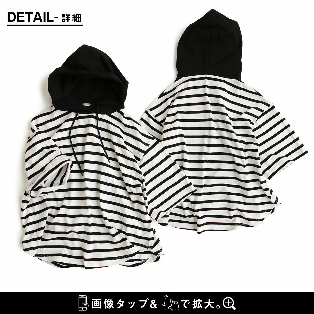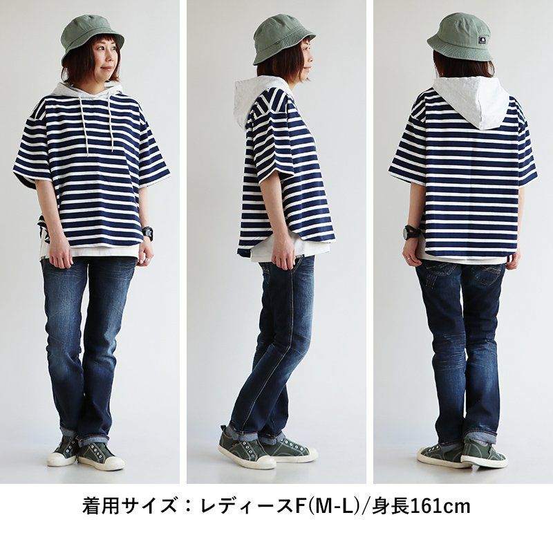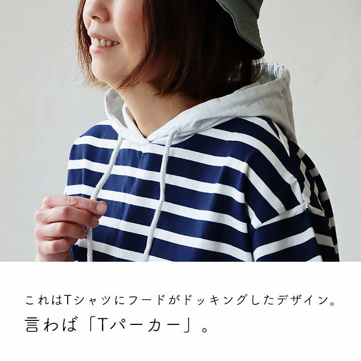 Tシャツとパーカーの良いとこどり。 Tシャツ 5分袖 レディース クルーネック フード付き ボーダー 無地 配色 綿100% コットン 天竺 伸縮性 重ね着風 体型カバー 大きいサイズ すっきり カジュアル 夏 パティ le colis ルコリ