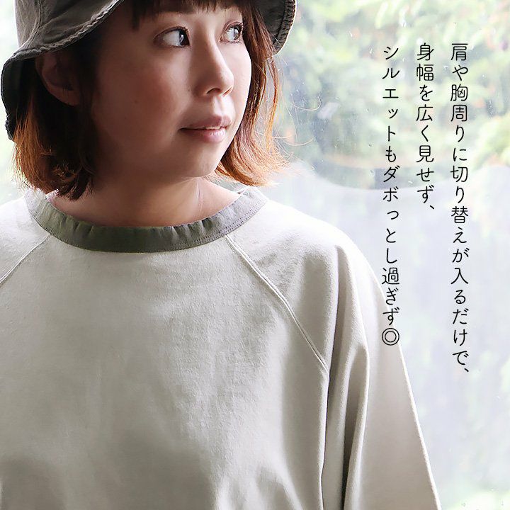 ゆるっと、ラフに。たくさんお世話になりそうです。 プルオーバー 5分袖 レディース クルーネック 袖リブ ロゴプリント 配色切り替え 綿100% 日本製 国産 ゆったり ドルマンシルエット 体型カバー 大きいサイズ 夏 夏服 カジュアル PATY パティ BLUE LAKE MARKET ブルーレイクマーケット