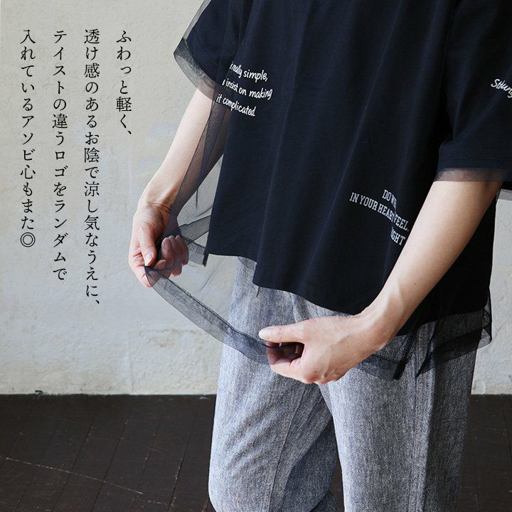 「いつも」に、透け感とアソビをプラス。 【メール便50】 Tシャツ 5分袖 レディース クルーネック シアー レイヤード 重ね着 ロゴ プリント 刺繍 コットン ポリエステル 薄手 通気性 軽い ゆったり 大きいサイズ 体型カバー カジュアル 夏 パティ