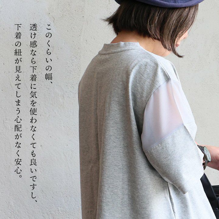 いつも通り着られる、私好みな涼し気「シアー」。 【メール便50】 Tシャツ 5分袖 レディース クルーネック 透け感 シアー 切り替え 綿100 コットン 薄手 通気性 涼しい 軽い 大きいサイズ 体型カバー 二の腕 すっきり カジュアル 夏 パティ