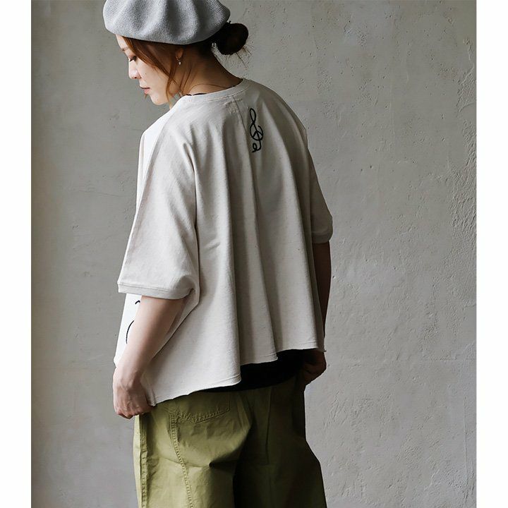 肩の力を抜いて、サッと着てもサマになるカタチ。 SLOW HANDS スローハンズ Tシャツ 5分袖 レディース クルーネック モモンガ ワイド 袖リブ 綿麻 ネップ混 刺繍 猫 ネコ アニマル しっかり生地 大きいサイズ 体型カバー カジュアル 夏 パティ