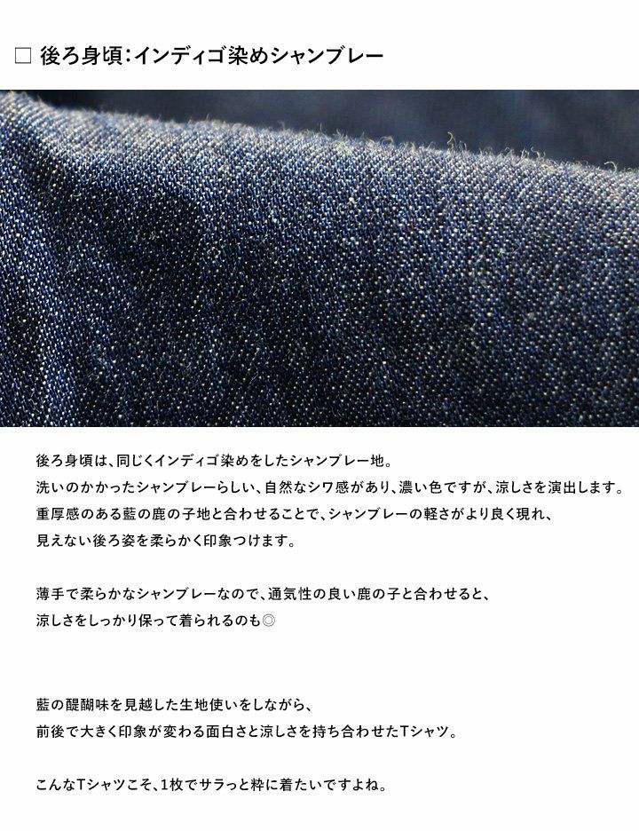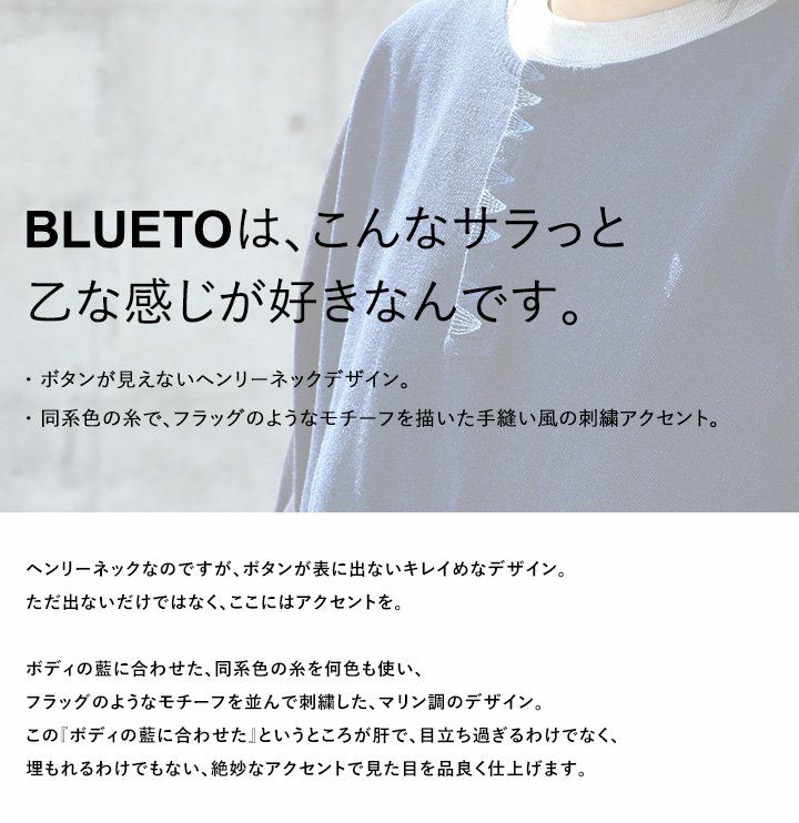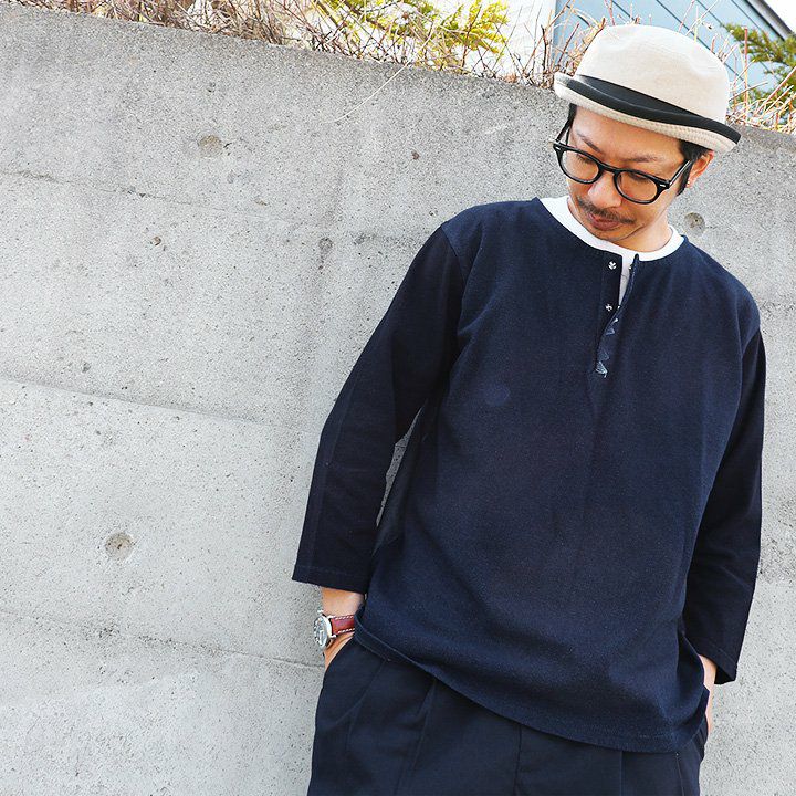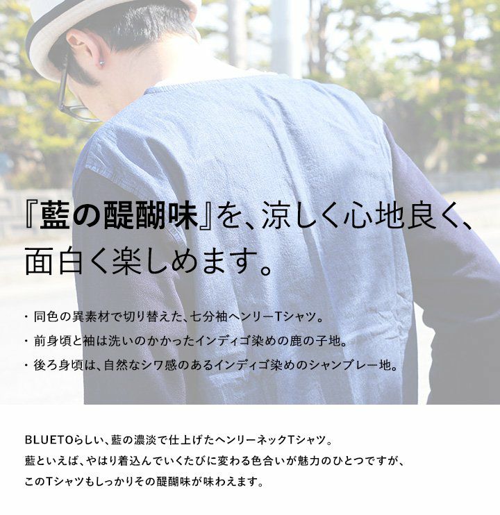 他の画像を見る 心もリラックスするような、『藍』での面白さ。 (ブルート) BLUETO Tシャツ 七分袖 ヘンリーネック 【インディゴ染め 鹿の子 シャンブレー 切り替え】 販売価格 ¥ 4,950 税込 在庫切れ カートに入れる お気に入りに登録する