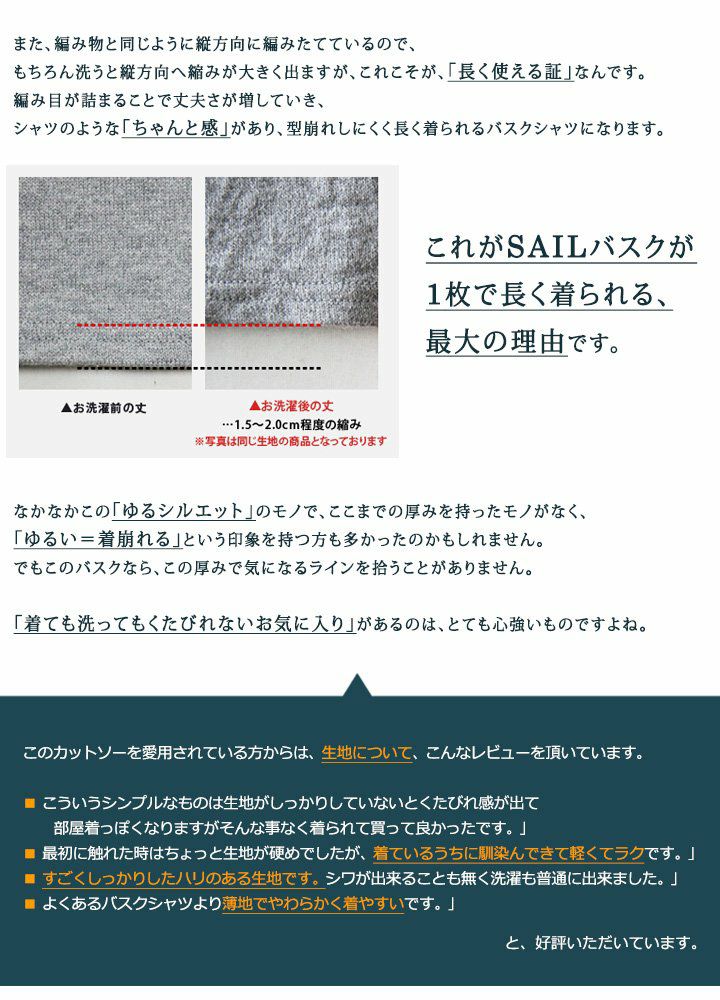 他の画像を見る 「シャツのようなきちんと感。」で長く着られる『日本製』七分袖バスク。 (セイル) SAIL バスクシャツ 七分袖 7分袖 カットソー 『配色 パイピング ツバメ 刺繍』 日本製 綿100% 無地 販売価格 ¥ 5,390 税込 在庫切れ カートに入れる お気に入りに登録する