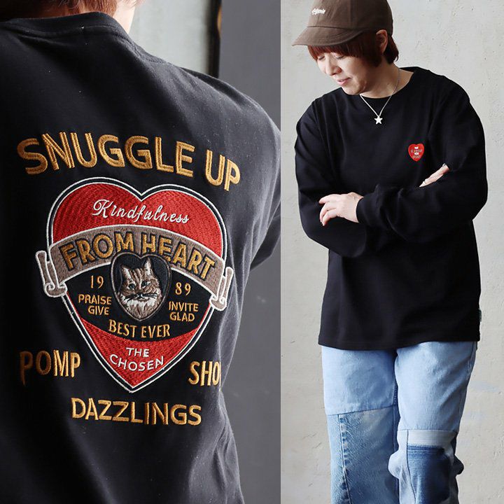絶妙なレトロ感。 カットソー ロンTEE 長袖 メンズ レディース クルーネック ネコ 猫 アニマル 刺繍 薄手 綿100 コットン 天竺 オープンエンド 袖リブ しっかり生地 タフ 伸縮性 カジュアル パティ
