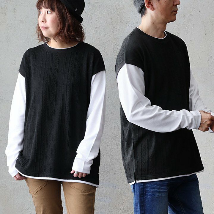 重ね着したかのようなリアルさなのに、すっきり。 カットソー 長袖 メンズ レディース クルーネック 重ね着風 フェイクレイヤード ニットベスト ロンT コットン ポリエステル 伸縮性 大きいサイズ カジュアル 春 パティ