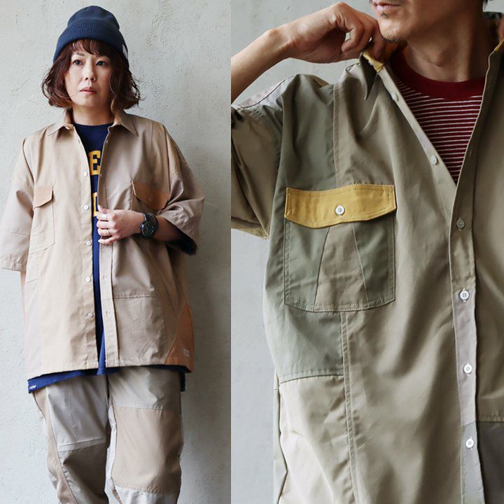 ミリタリーも、「一点もの」で差をつけて。 シャツ 半袖シャツ メンズ レディース 古着 リメイク パッチワーク ミリタリー 夏 ワッペン 配色切り替え 無地 大きいサイズ ゆったり 体型カバー カジュアル ヴィンテージ パティ Mr.remakman ミスターリメイクマン
