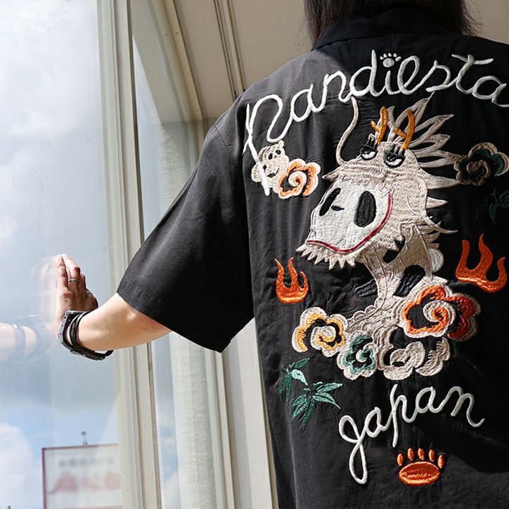 5. PANDIESTAJAPAN パンディエスタジャパン シャツ 開襟シャツ 半袖 メンズ レディース レーヨン テンセル 薄手 涼しい パンダ 熊猫 刺繍 ドラゴン アニマル 大きいサイズ すっきり カジュアル 夏 パティ