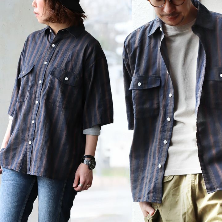ミリタリー・ワーク由来の無骨さを、「渋く」アレンジ。 シャツ レディース メンズ 半袖 コットン 綿100% ストライプ おしゃれ ポケット ワイド ボックスシルエット 着痩せ 半袖シャツ 大きいサイズ 仕事 オフィス カジュアル パティ modem Design×BLUETO モデムデザイン