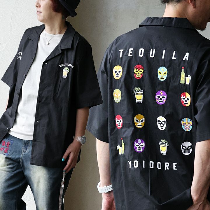 「YOIDORE!TEQUILA!」 シャツ 5分袖 メンズ レディース 刺繍 覆面レスラー お酒 テキーラ 綿100 コットン しっかり生地 ハリ 大きいサイズ 体型カバー 重ね着 カジュアル パティ YOIDORE ヨイドレ