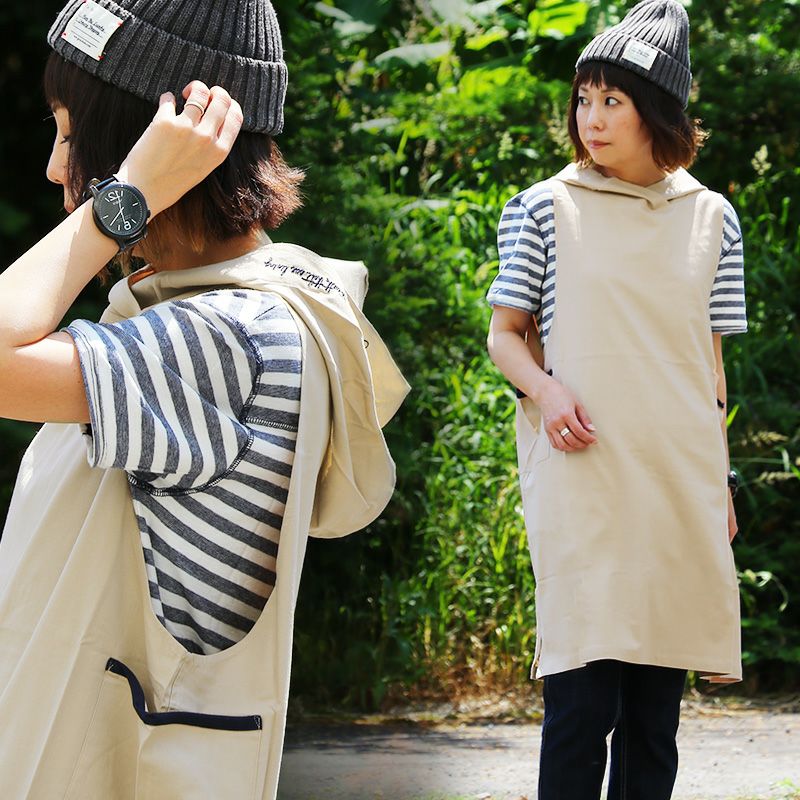 「ワンピース」と言うより、カッコよく渋い「ロングベスト」。 ワンピース ノースリーブ ロング プルオーバー 刺繍入り フード ベスト ワイドアームホール ガーデニングポケット 麻 レーヨン ストレッチ レディース トップス 夏 40代 50代 SAIL [セイル]