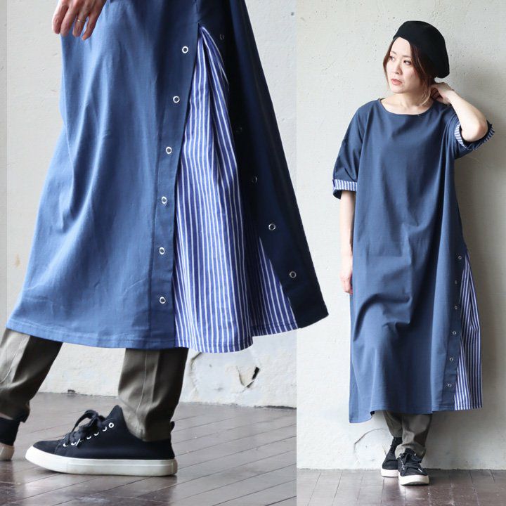 さりげないくらいの「遊び」が丁度良い! ワンピース 半袖 ロング丈 レディース 異素材切り替え 無地 ストライプ 綿100% 天竺地 伸縮性 薄手 涼しい ポケット付き 体型カバー ゆったり 楽ちん 着痩せ カジュアル PATY パティ