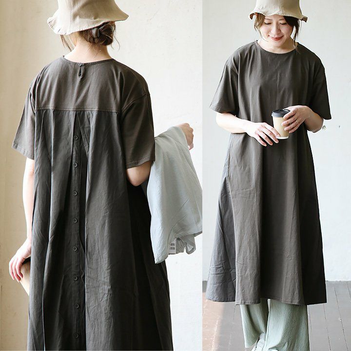 前と後ろ、印象の違いにギャップ。 ワンピース ワンピ 半袖 レディース クルーネック 綿100% 布帛 天竺 フェイクボタン 異素材切り替え 薄手 涼しい 夏 夏服 大きいサイズ ゆったり 体型カバー 着痩せ カジュアル PATY パティ