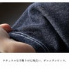 本体:程よく厚みがあり、ふわっとした、とても柔らかく気持ち良い伸びを持つカットデニム地。軽やかな着心地で、ヘリンボーンの織り柄とスラブ感が表面に見られます。光にかざすと若干の透け感があります。