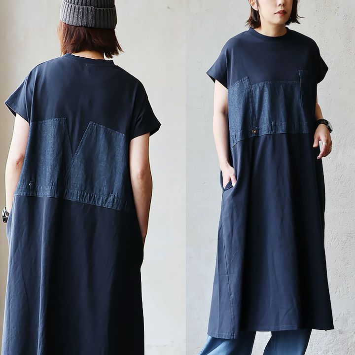 このワンピースなら、手抜き感なし。 ワンピース レディース 半袖 マキシ丈 クルーネック 綿100 コットン 天竺 デニム切り替え 体型カバー 大きいサイズ 着痩せ すっきり カジュアル 夏 パティ