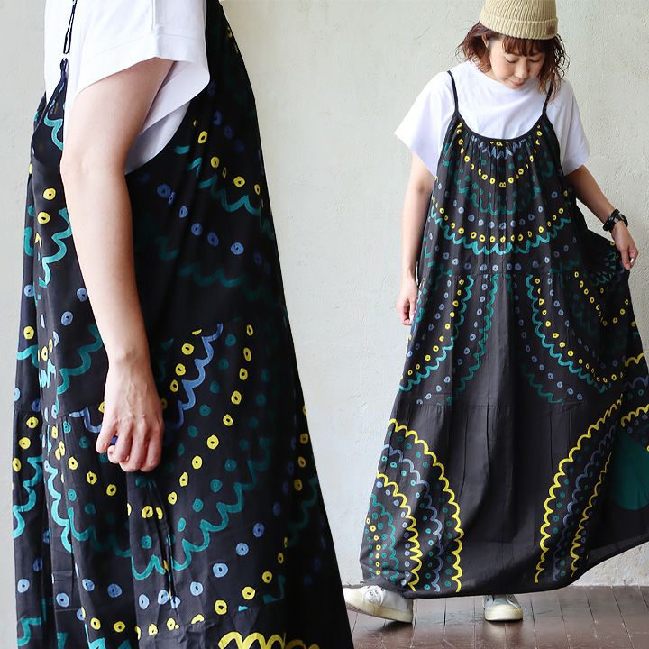 こんなワンピース、他にはなくて一目置かれるかもしれません。 ワンピース ワンピ キャミソールワンピース マキシ丈 レディース 重ね着 総柄 鳥 手書き風 ブラック 綿100 コットン 薄手 軽い 通気性 ゆったり 体型カバー 春 夏 秋 カジュアル パティ