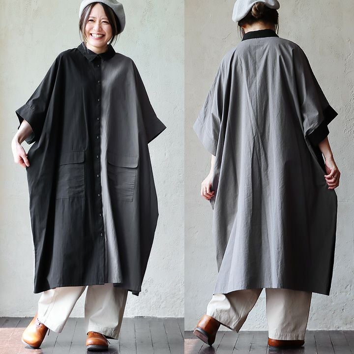 カタチも配色も、存在感ばっちり。 シャツ ワンピース ワンピ 半袖 レディース 配色 切り替え 綿100 コットン タイプライター しっかり生地 軽い 二の腕 体型カバー カジュアル 夏 夏服 パティ