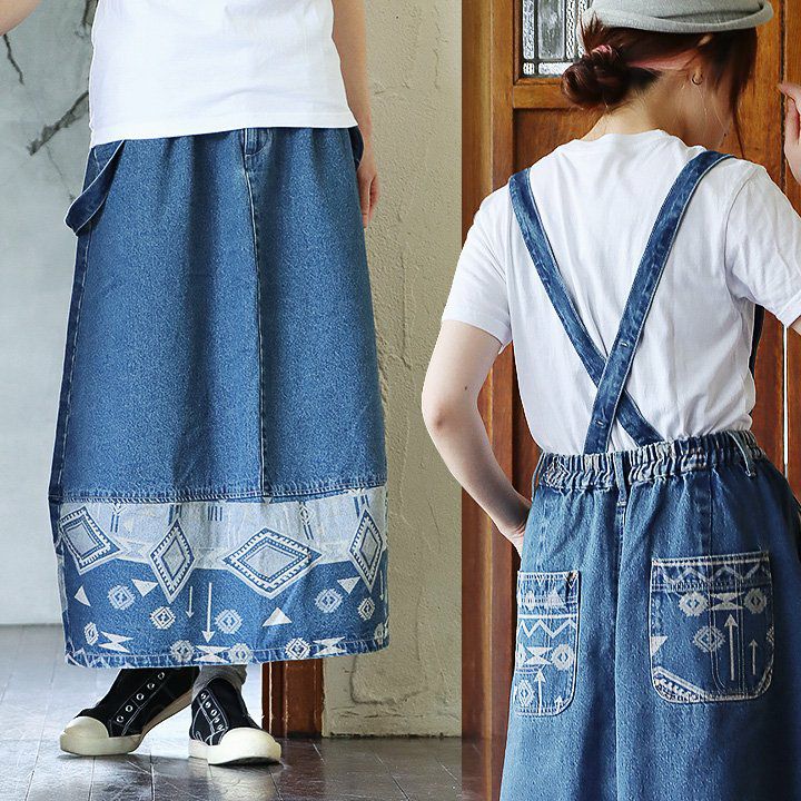 アメカジデニムがお好きなら。 バルーンスカート デニム レディース トライバル柄 配色切り替え 綿100% 中肉厚 ウエストゴム ゆったり 体型カバー カジュアル アメカジ PATY パティ
