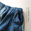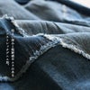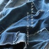 ベースは程よく厚みのあるノンストレッチデニム地を表裏どちらも使い仕立てています。デニム地特有の粗野感とスラブの縦落ちが見られます。伸縮性・透け感ともにありません。