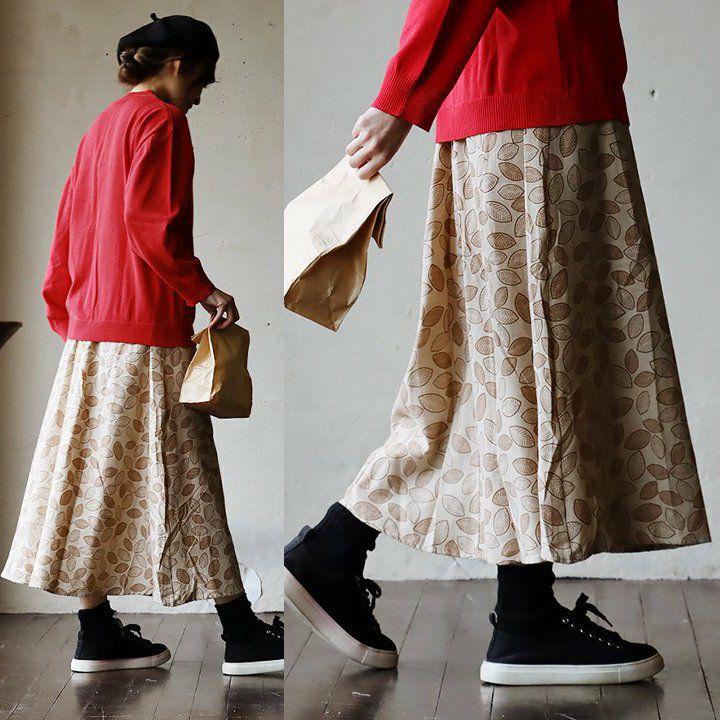 5. スカート ロングスカート ロング丈 レディース リーフ柄 葉っぱ 綿100% コットン 裏地付き ウエストゴム ゆったり 体型カバー カジュアル