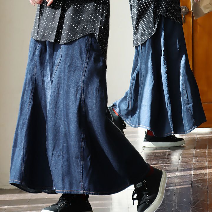 5. スカート ロング丈 デニム レディース 綿100% コットン 波型 ステッチ しっかり生地 ウエストゴム ゆったり 体型カバー 大きいサイズ ラクチン カジュアル