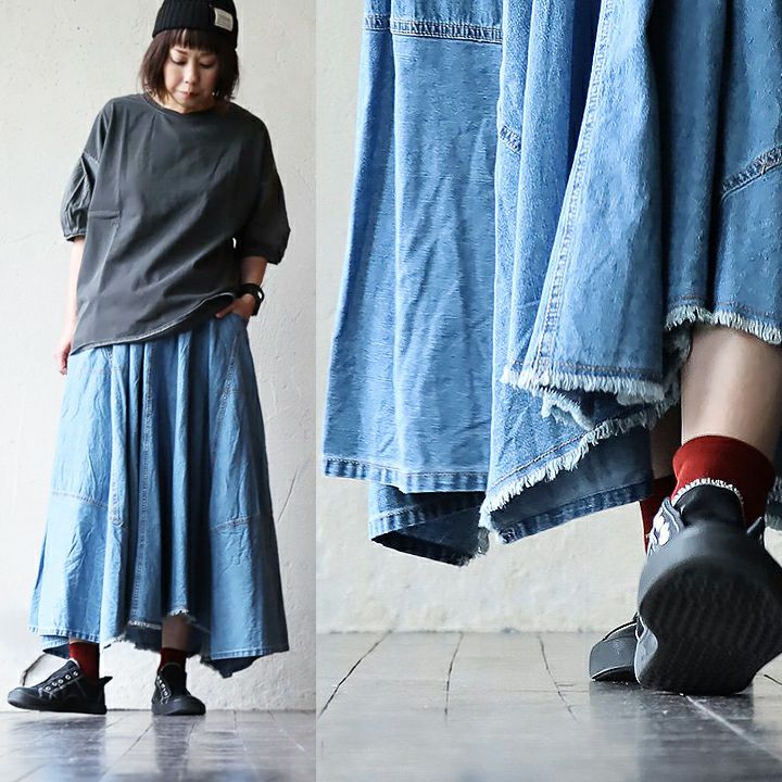 見惚れるカタチ。 スカート フレアスカート マキシ丈 レディース デニム 綿100% コットン 薄手 7オンス 薄手 軽い ノンストレッチ ウエストゴム ゆったり 体型カバー 大きいサイズ カジュアル パティ