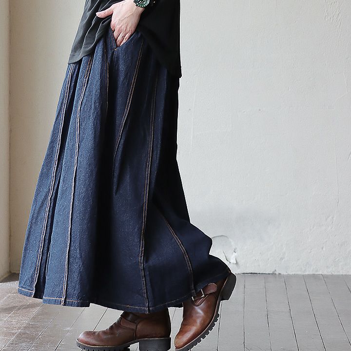 5. マキシスカート レディース スカート ロングスカート デニム ステッチ プリーツ 大きいサイズ マキシ丈スカート ウエストゴム 紐 変形 ボリューム リメイク カジュアル メンズライク パティ BLUETO ブルート
