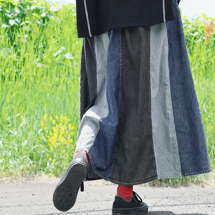 5. カジュアル スカート かっこいい 夏 軽い 柔らかい 涼しい ウエストゴム 紐 異素材切替 リメイク風 ロング丈 甘くない 大人 柄 ストライプ ポケット パティ GENTIL ジャンティ