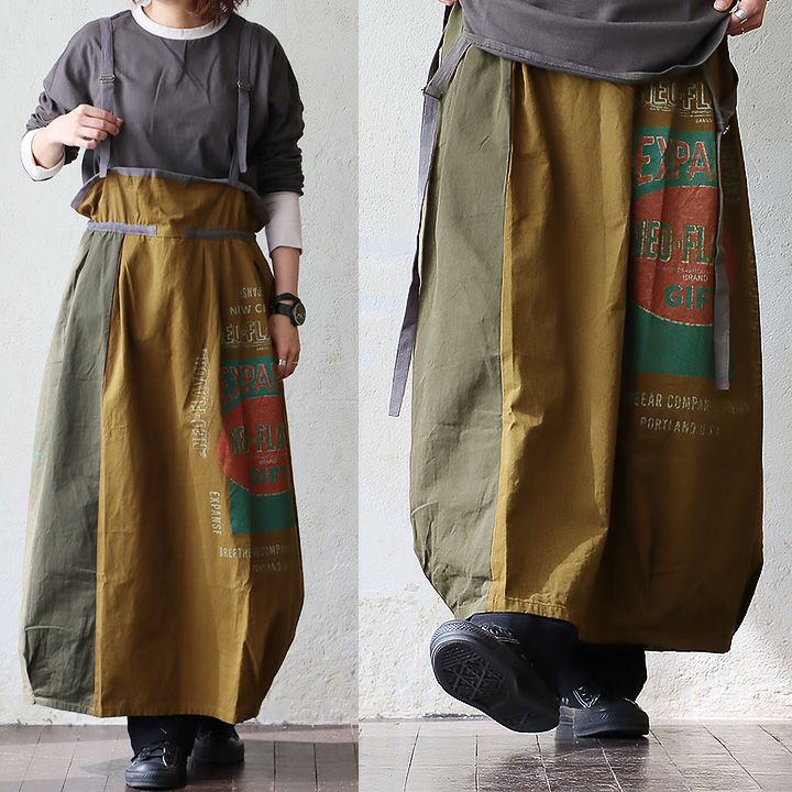 パンツ派には、他にはない個性が光るこんなスカートが無きゃダメ。 KRIFF MAYER クリフメイヤー サロペットスカート サロペット スカート マキシ丈 レディース バルーン サスペンダー付き プリント 切り替え 綿100% コットン ツイル ミリタリー メンズライク パティ