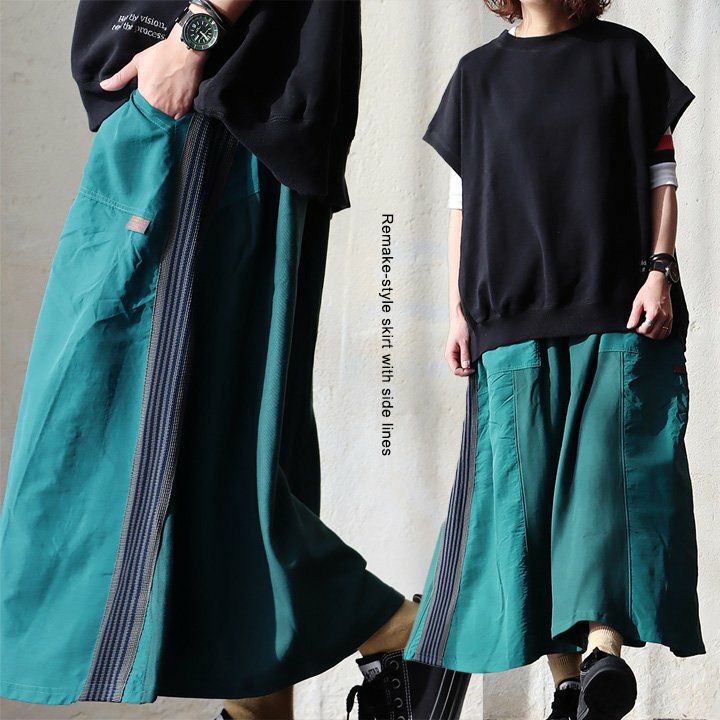 5. スカート マキシ丈 マキシ丈スカート トラックスカート フレア レディース リメイク風 サイドライン コットン ナイロン 異素材切り替え ウエストゴム カジュアル パティ