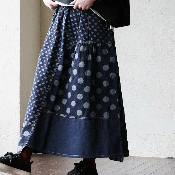 過ぎずに楽しめる、カジュアル派好みなドットデニム。 スカート フレアスカート デニム レディース ドット柄 切り替え ジャガード 綿100 コットン しっかり生地 ウエストゴム ゆったり 大きいサイズ 体型カバー カジュアル 夏 パティ