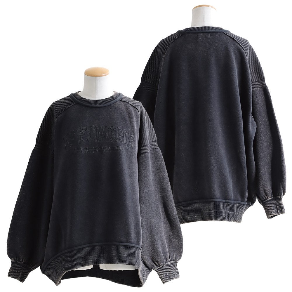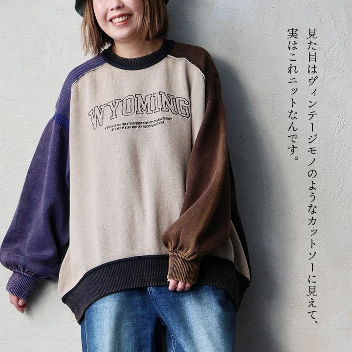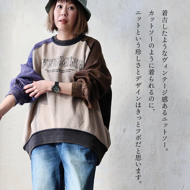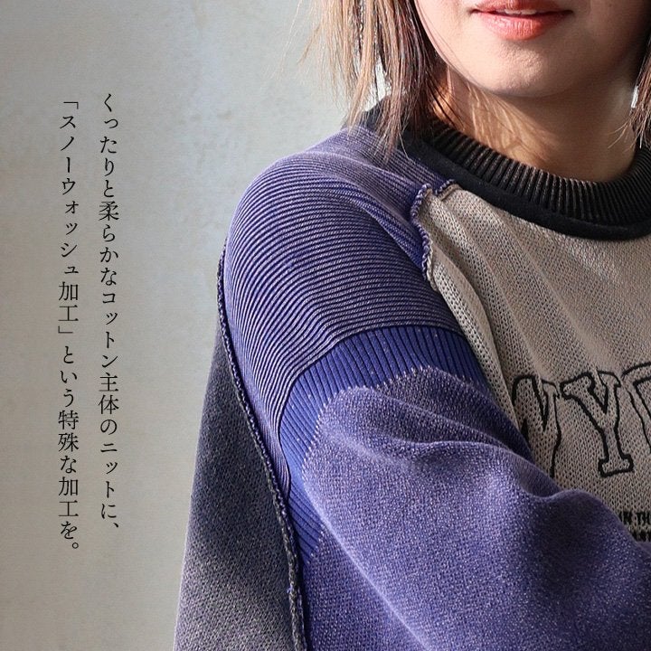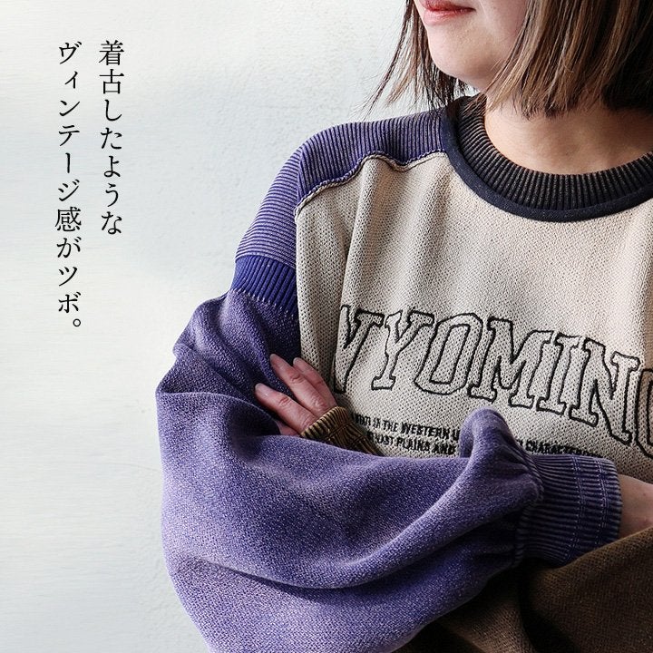 着古したようなヴィンテージ感がツボ。 ニットソー 長袖 レディース クルーネック コットン ポリエステル スノーウォッシュ 褪せ色 ロゴ 袖リブ ゆったり 大きいサイズ 体型カバー カジュアル ヴィンテージ レトロ アメカジ パティ