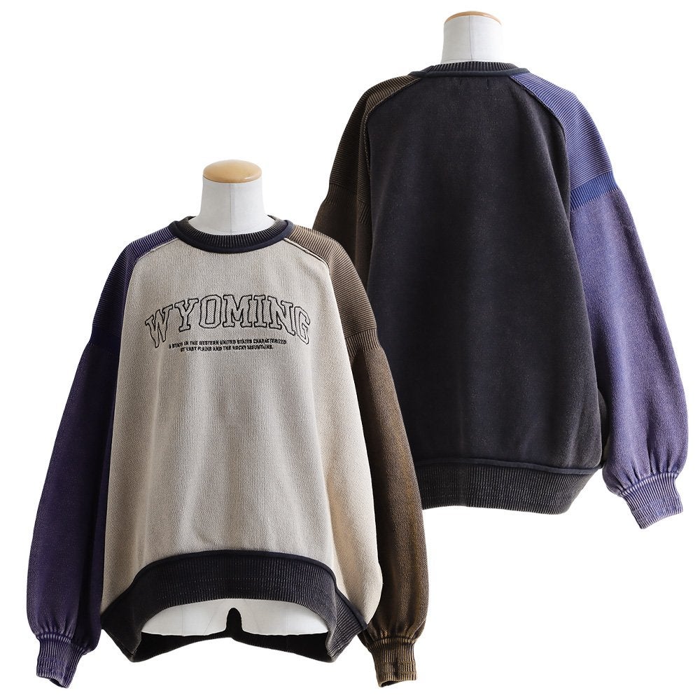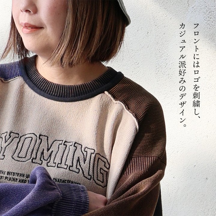 スウェット?ニット?錯覚するような、「デザインと楽さ」に虜。 【訳あり】ニット 長袖 スウェット風 レディース クルーネック ロゴ ジャガード織り 袖ライン Vガゼット ロックコード 伸縮性 ゆったり ワイド 大きいサイズ 体型カバー カジュアル アメカジ 冬 パティ