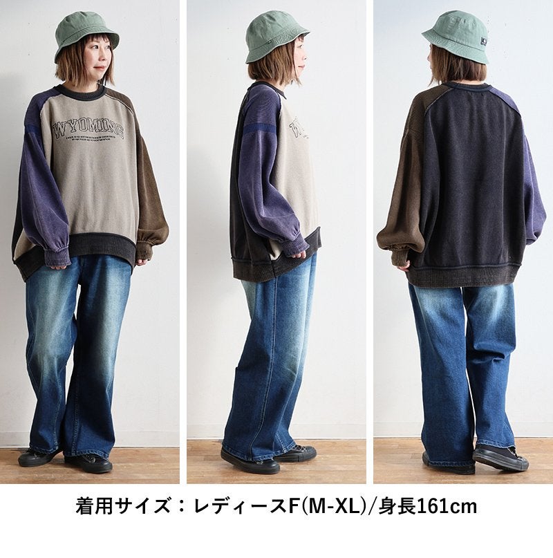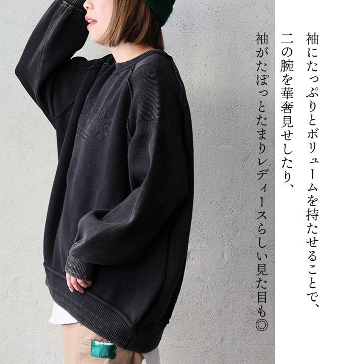 定番だからこそ、「より1枚で決まる」のがいい。 スウェット 長袖 クルーネック レディース ロゴプリント クレイジー 袖配色切り替え 綿100 コットン ミニ裏毛 伸縮性 大きいサイズ 体型カバー カジュアル 秋 冬 パティ