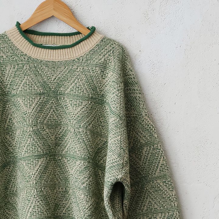 5. ニット 長袖 クルーネック レディース ジャガード アクリル100 ダイヤ柄 総柄 伸縮性 厚手 パイピング 大きいサイズ 体型カバー カジュアル 秋 冬 パティ