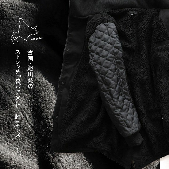 「体感温度+4」でマフラー要らずのストレッチコート。 モッズコート メンズ レディース ストレッチ 裏ボア スリム ミリタリー コート アウター モッズ ロング 着痩せ ハイネック 襟高 小顔 袖リブ 中綿 防寒 ボア 暖かい かっこいい 動きやすい 細見え ミドル丈 ロングコート メンズライク 冬 PATY パティ ALISTAIR アリステア