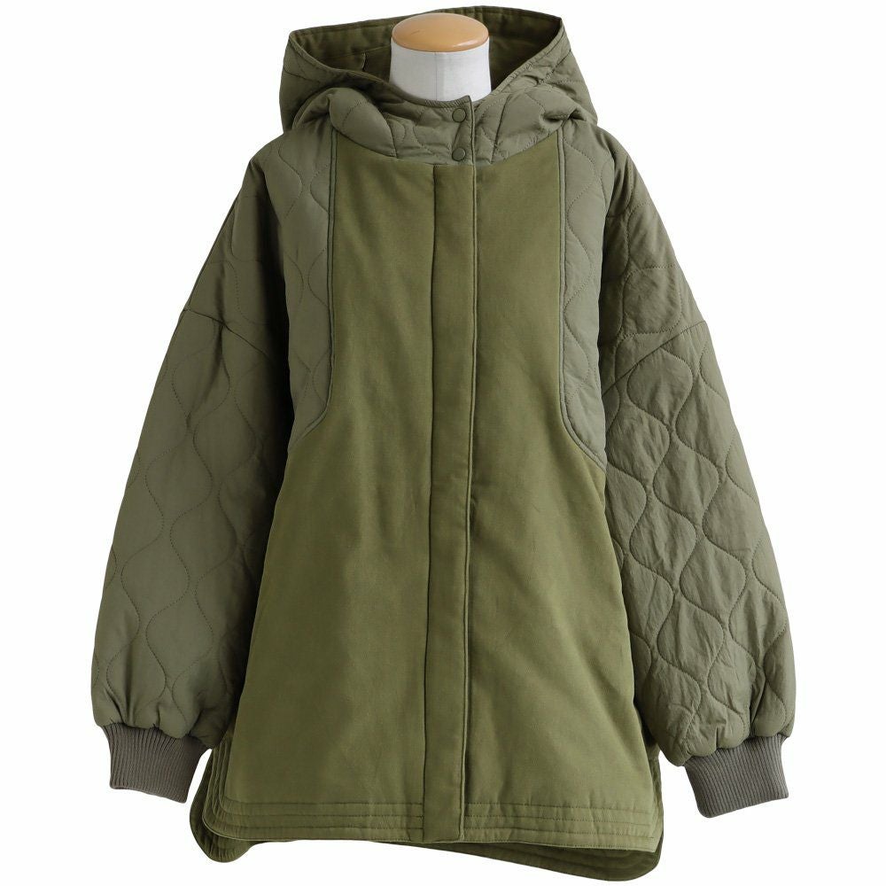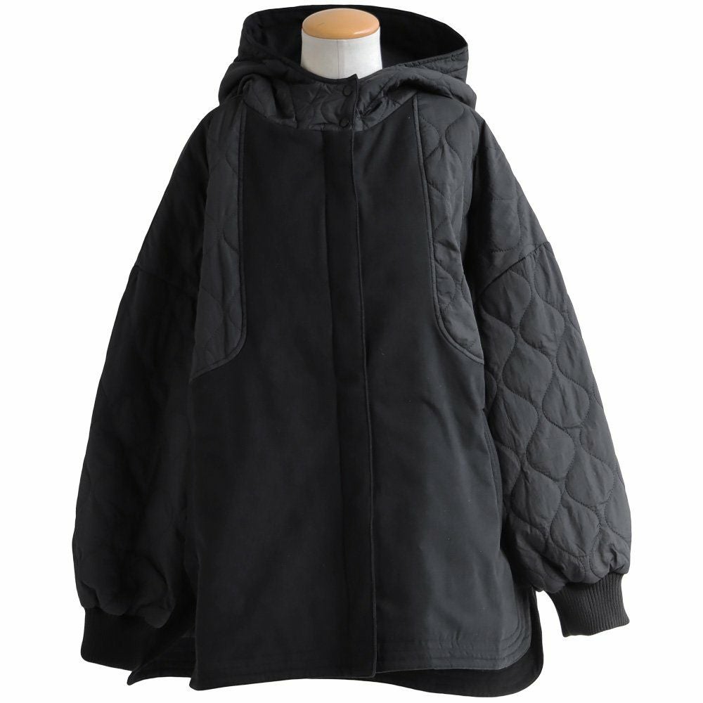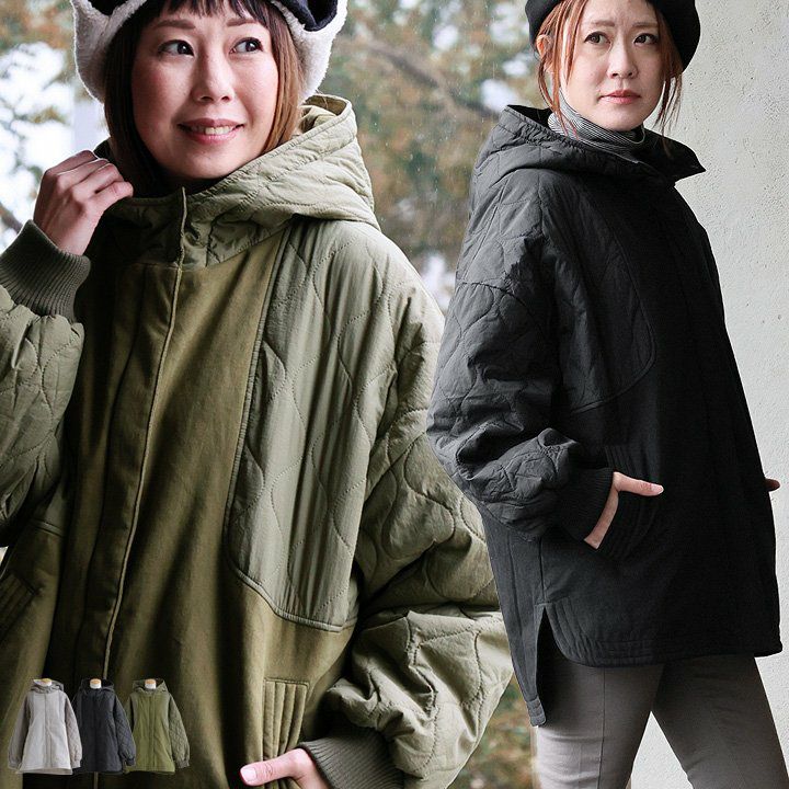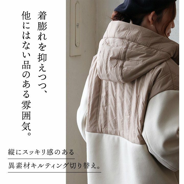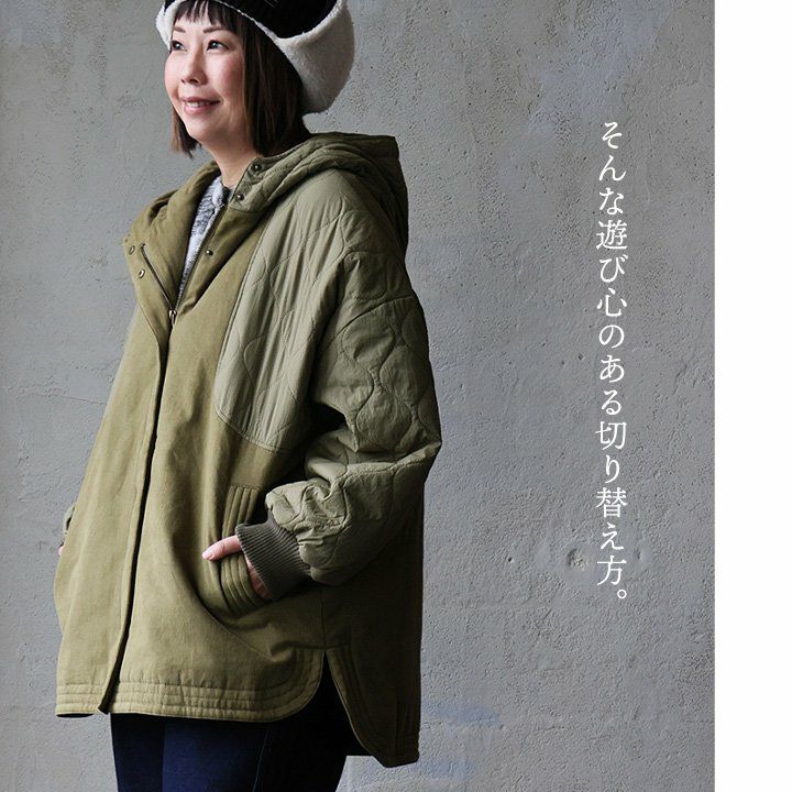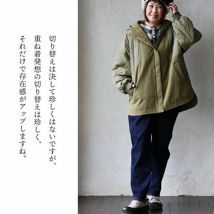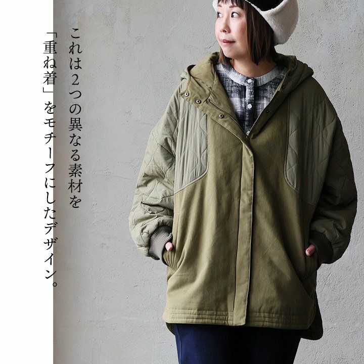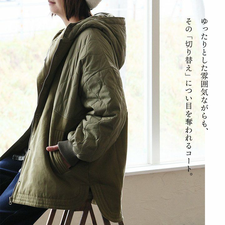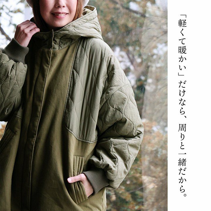 「軽くて暖かい」だけなら、周りと一緒だから。 コート 中綿 レディース フードコート キルティング ツイル 異素材切り替え 重ね着風 ドルマン 軽い 暖かい ゆったり 大きいサイズ 秋 冬 カジュアル パティ