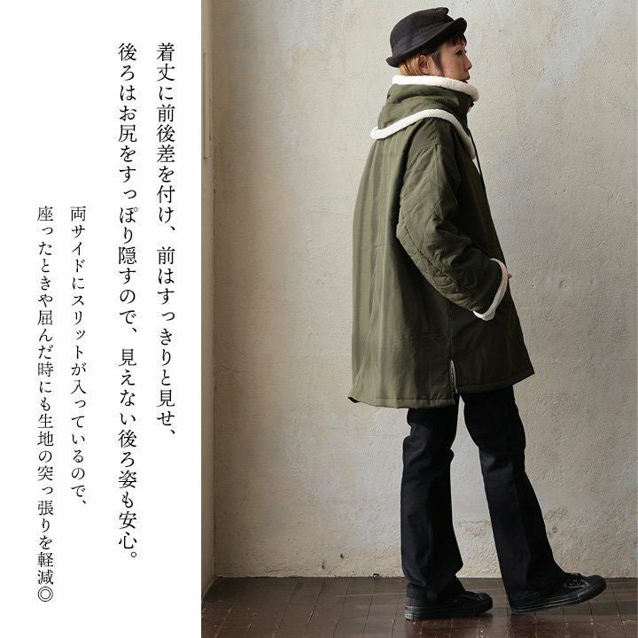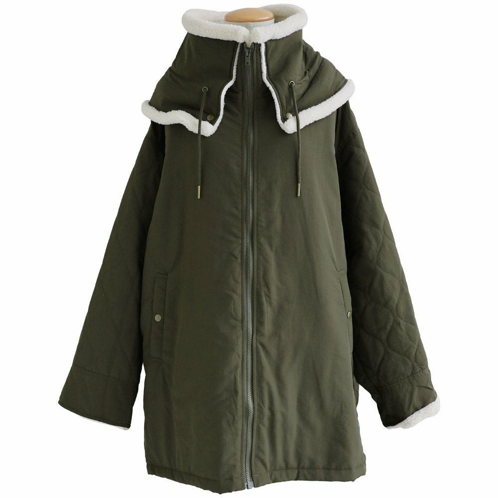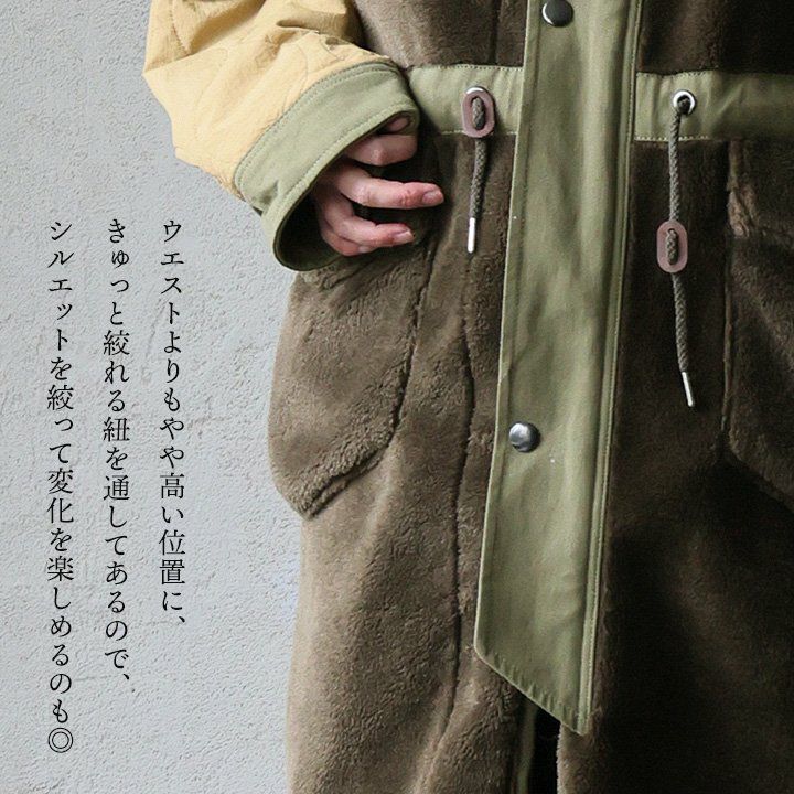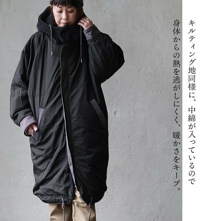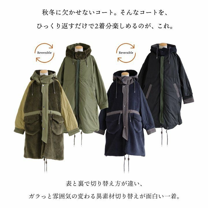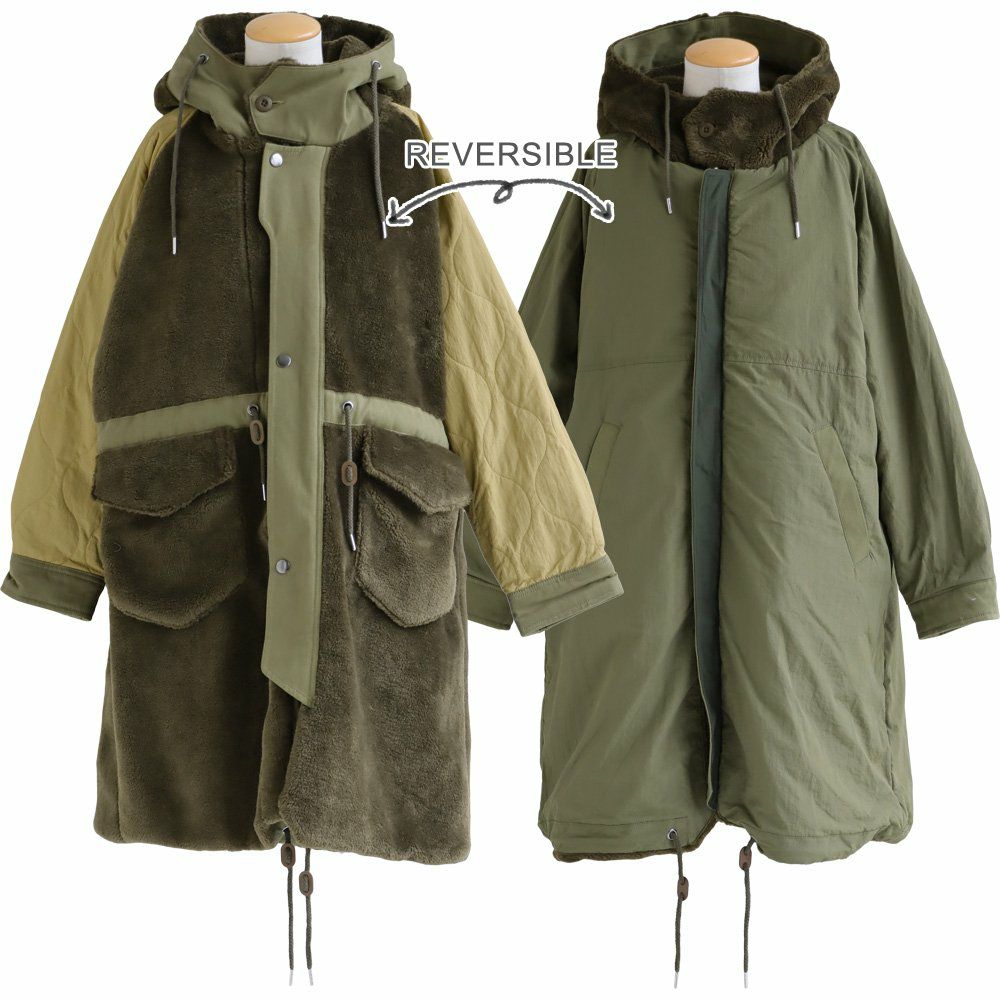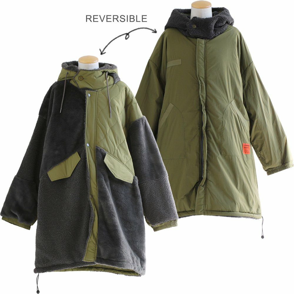 チグハグが面白くて、暖かくて、そのうえひっくり返しても楽しめちゃう。 コート ロングコート ミリタリー レディース ロング丈 リバーシブル スタンドネック フード付き ボア 中綿 キルト 異素材切り替え 暖かい お尻隠れる 体型カバー 大きいサイズ カジュアル 秋 冬 パティ GENTIL ジャンティ