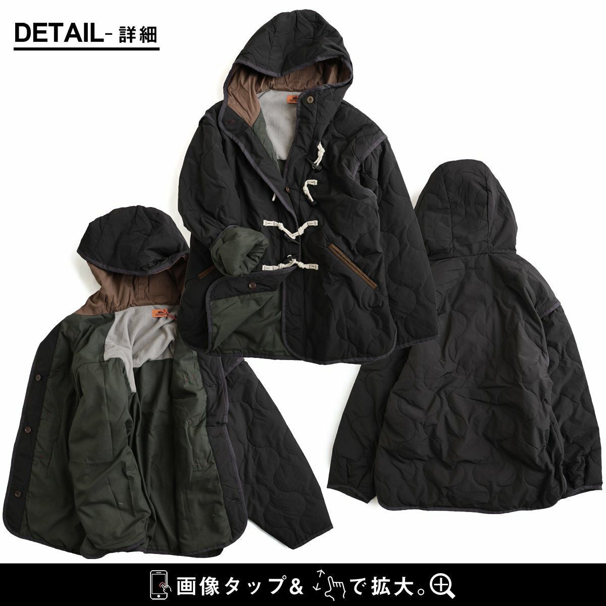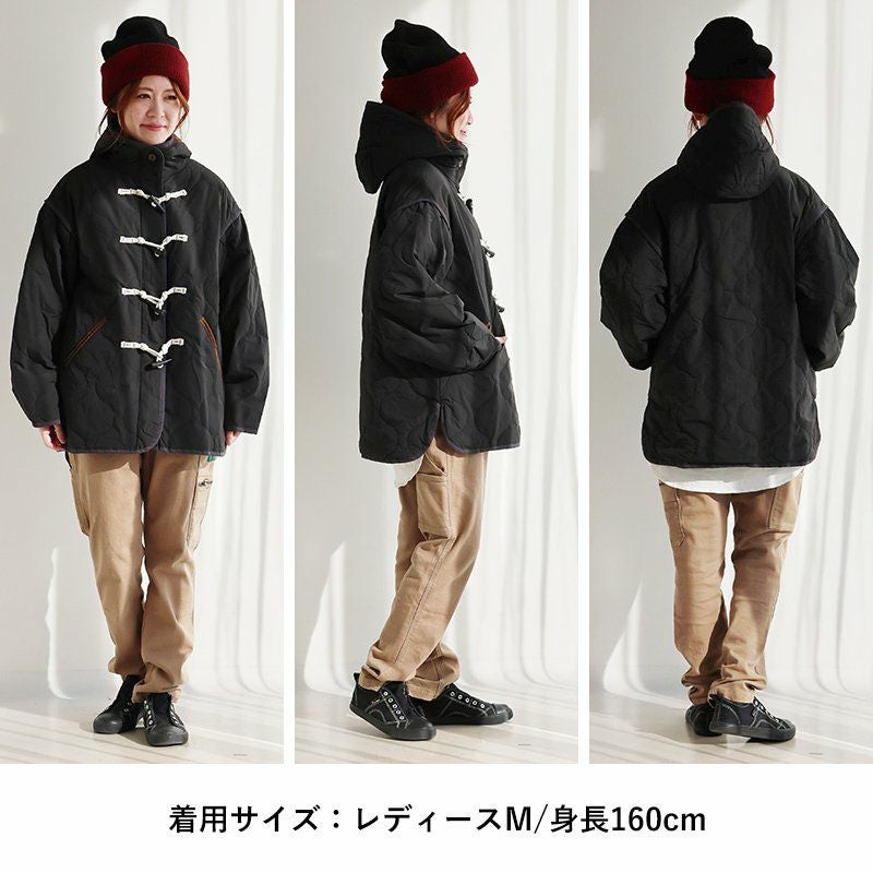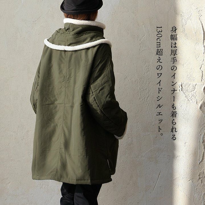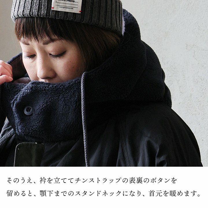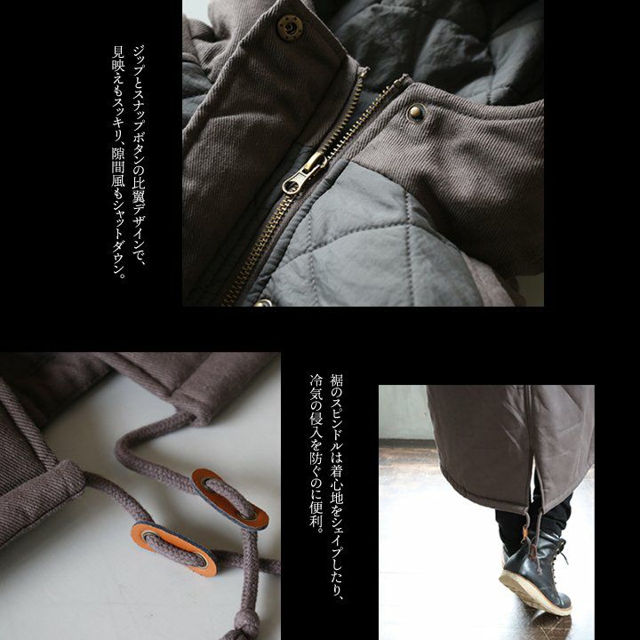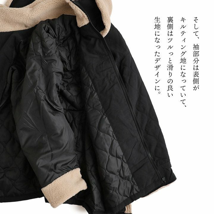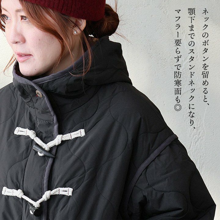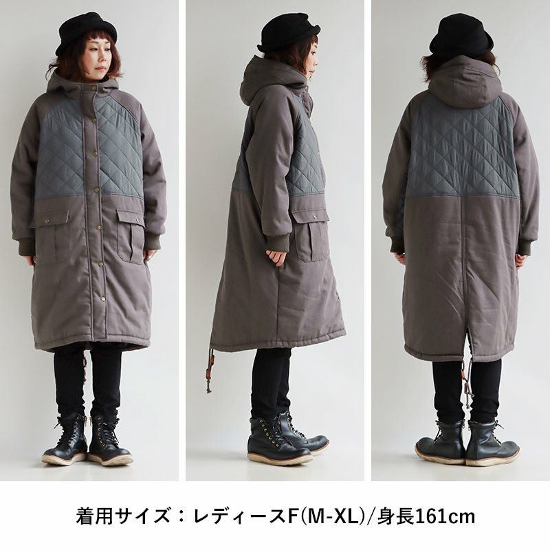 チグハグが面白くて、暖かくて、そのうえひっくり返しても楽しめちゃう。 コート ロングコート ミリタリー レディース ロング丈 リバーシブル スタンドネック フード付き ボア 中綿 キルト 異素材切り替え 暖かい お尻隠れる 体型カバー 大きいサイズ カジュアル 秋 冬 パティ GENTIL ジャンティ