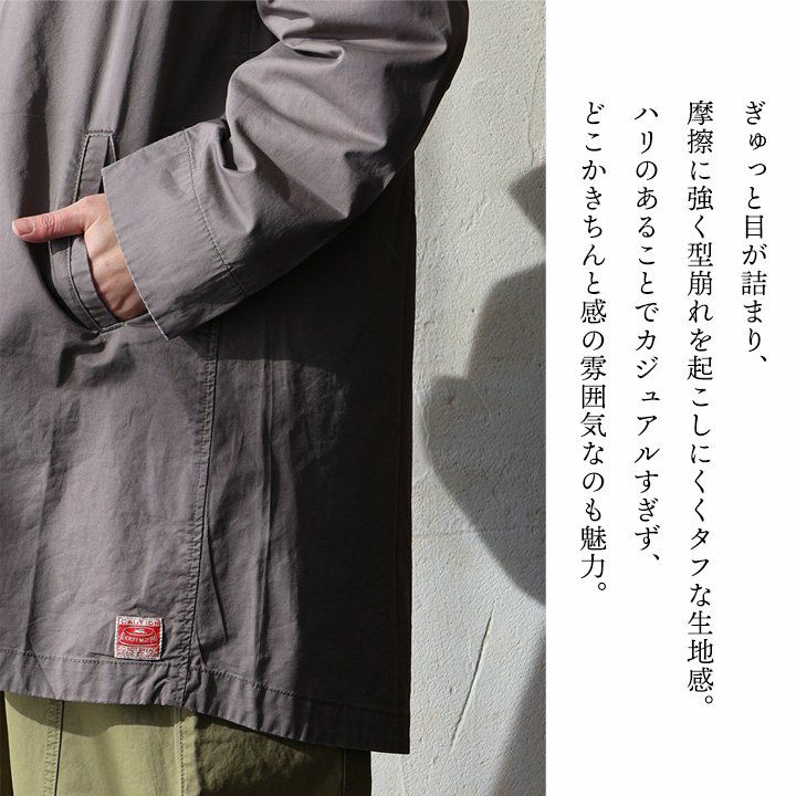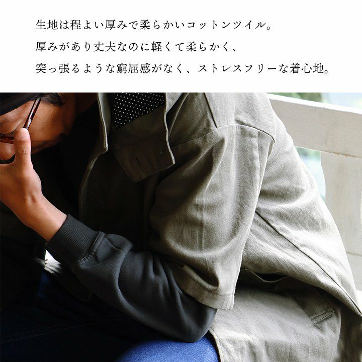 パーカーの上からでも楽に羽織れる、「スッキリ」コート。 コート ノーカラー 長袖 シャツジャケット シャツブルゾン メンズ レディース 袖ラインリブ ストレッチツイル 薄い ハリ 刺繍 ミドル丈 ロング スナップボタン 玉縁ポケット 襟無し カーディガン ミリタリー 体系カバー 大人 カジュアル PATY パティ Mr.Lumberjack